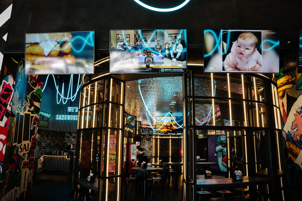 This location features a jaw-dropping amount of design detail. The dining area is enclosed in a custom-made steel-beam structure, decked with unique street art, modern lighting, and wall-to-wall televisions showing major sporting events. We have sky-high ceilings and wrap-around LED signage overhead that’s symbolic of what you’ll find inside big sports arenas like Crypto.com. We’re serious when we say we value restaurant architecture as much as food design, creating an experience out of your meal.